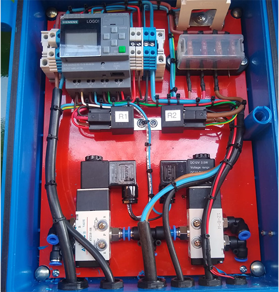 Control electrónico en caja estanca, con PLC SIEMENS, trampa de agua con manómetro y regulador de presión de trabajo, fusibles, electroválvulas, etc.