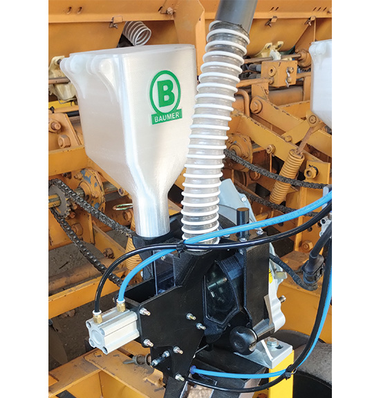 • Embudo alimentador de aluminio o plástico, con exclusivo acomodador de semillas
